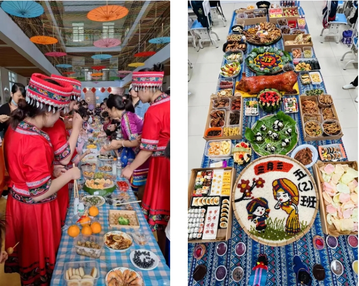 “長(zhǎng)桌宴”又稱合攏宴,是侗族、苗族、瑤族等多個(gè)民族的風(fēng)俗習(xí)慣,常用于接親嫁女、滿月酒、村寨聯(lián)誼等宴飲活動(dòng),代表最為隆重的待客禮俗,已有幾千年歷史。“長(zhǎng)桌宴”上有壯族特色的五色糯米飯、艾葉糍粑、壯粽,苗族的傳統(tǒng)佳肴,還有黎族的三色飯……一份份美食造型美觀、色彩鮮艷、香味撲鼻。圖為集團(tuán)職工拍攝的孩子參加學(xué)?!叭氯被顒?dòng)。